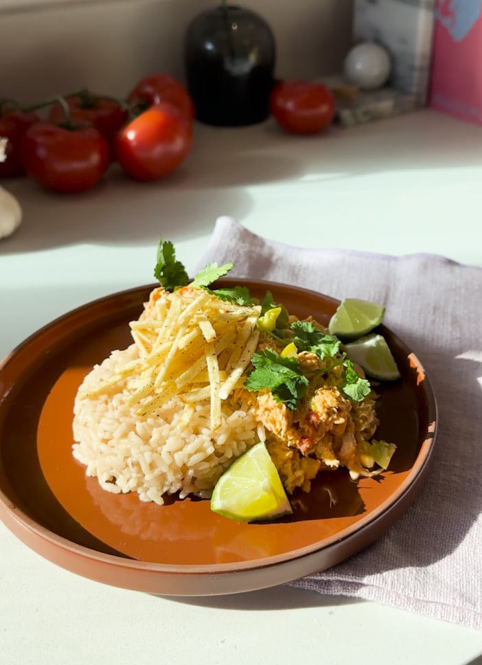 - To serve, plate the Brazilian Chicken Stroganoff with rice and top with potato sticks.