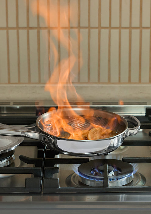 The Titanium Large Always Pan Pro excels at searing, flipping, deglazing, deep frying, and so much more. Think: pan-fried potatoes, a perfectly seared steak, crispy fish, morning omelettes, creamy pasta dishes, and so much more.