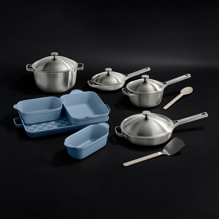 Each piece features a tri-ply construction that combines the high heat benefits of stainless steel or cast iron with the convenience of a nonstick effect. The original Always Pan and Perfect Pot (and their Mini versions) also come in our iconic colors while this cookware has a chrome exterior.
